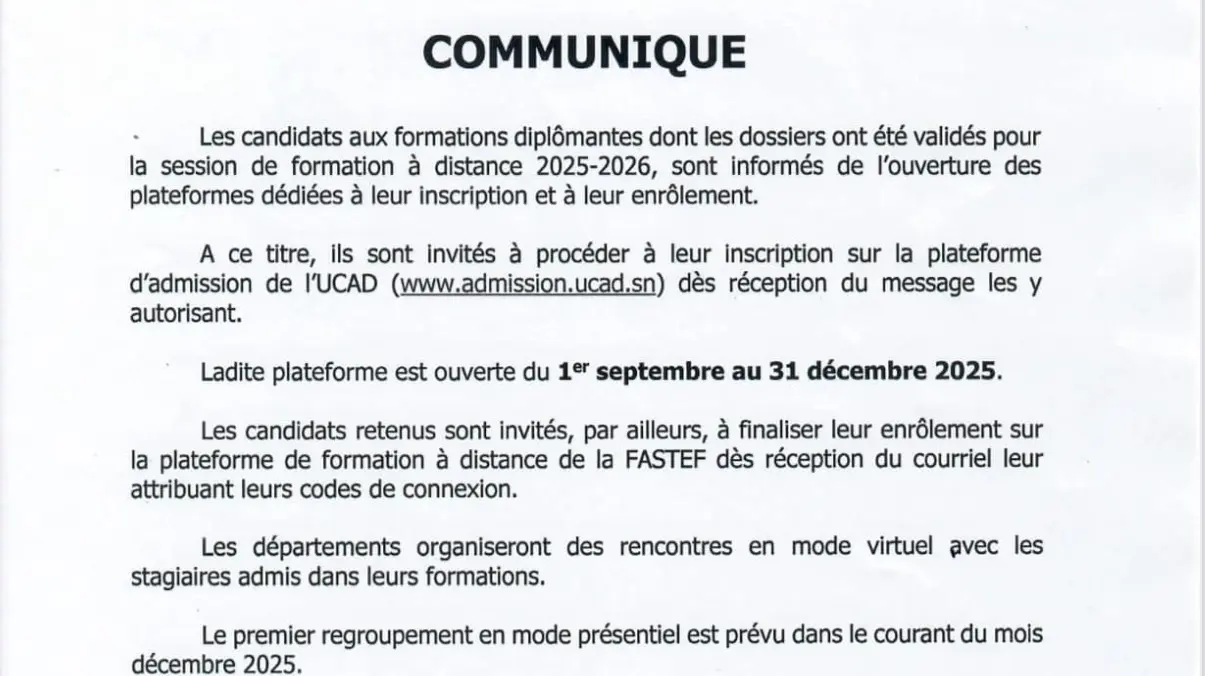 Après cette étape, les candidats admis devront finaliser leur enrôlement sur la plateforme de formation à distance de la FASTEF, dès réception du courriel contenant leurs identifiants de connexion.